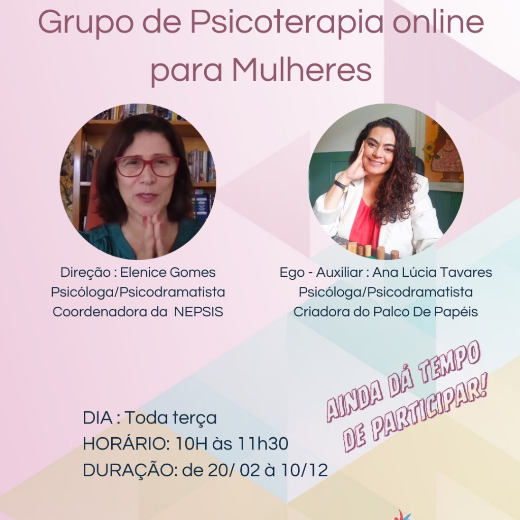 Como desdobramento dessa experiência, vimos a necessidade de oferecer ao público feminino uma psicoterapia grupal com metodologia psicodramática, com sessões semanais de uma hora e meia de duração. Assim, constituímos uma unidade funcional: eu como diretora e Ana Lúcia Tavares – criadora do Palco de Papeis – como ego-auxiliar e oferecemos a proposta em nossas redes sociais virtuais. Iniciamos esse trabalho no início de 2024, também on-line pelo Zoom, com o intuito de finalizá-lo ao final desse mesmo ano, o que foi revisto durante o processo e alteramos o grupo com característica aberta para a entrada de novas interessadas, agora com tempo indeterminado de duração.