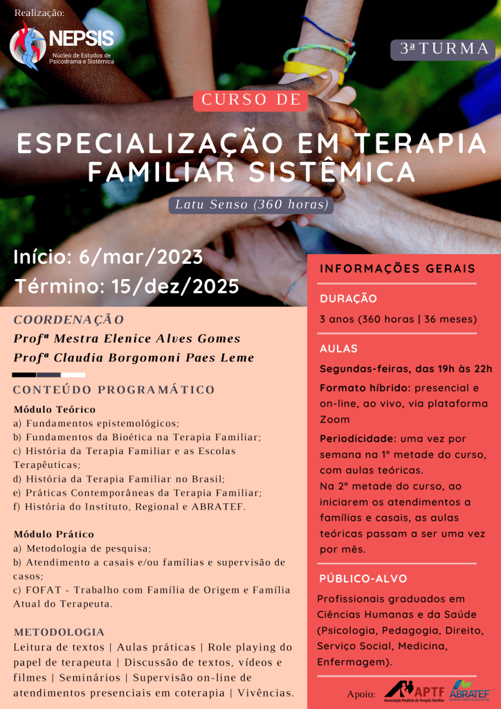 Especialização em Terapia Familiar Sistêmica, 3° Turma NEPSIS, com início em 6 de março de 2023, em formato híbrido: presencial e on-line, ao vivo, via plataforma Zoom.